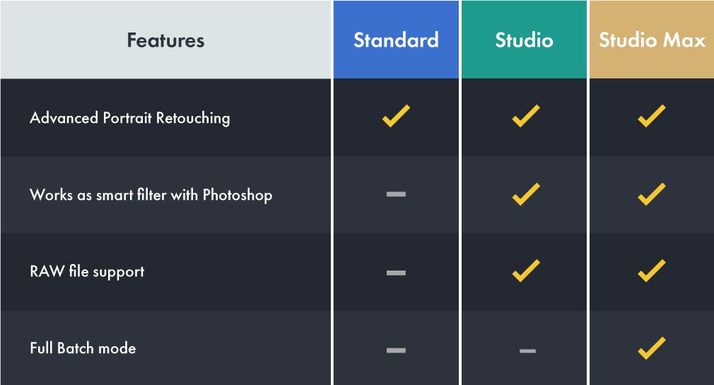 PortraitPro comes in three editions to suit your needs. For keen amateurs, PortraitPro Studio includes new Smart Filter functionality for Photoshop as well as handling RAW files directly and supporting different color spaces.