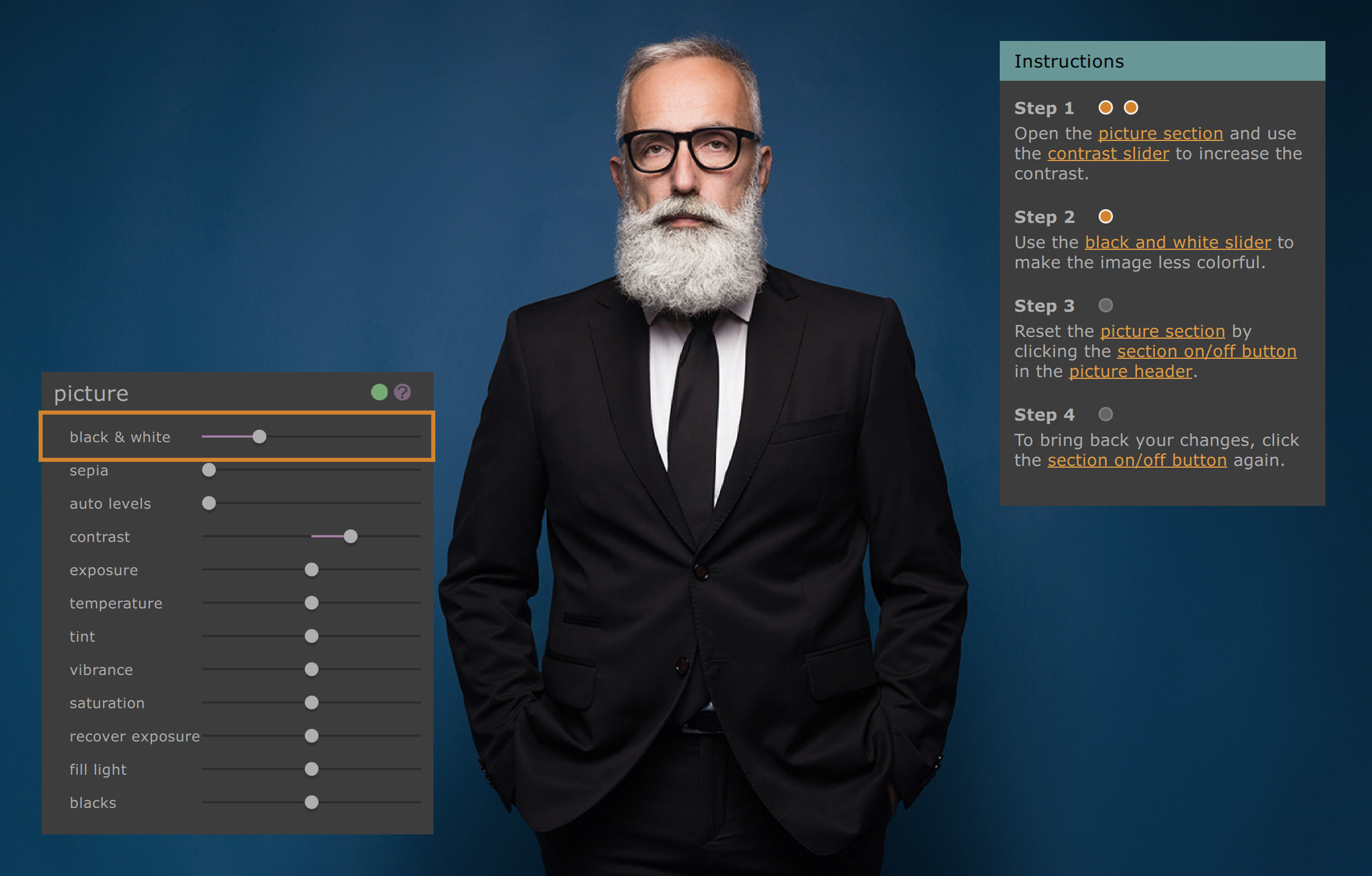 Utilizing the latest advancements in deep-learning and image-recognition science, PortraitPro Body 3 is able to locate the body's position in an image. Even complex or unusual poses can be detected. This speeds up your workflow and allows you to make more natural changes to your image.